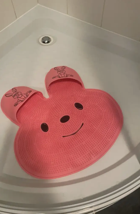 Covorașul de duș cu ventuze permite curățarea picioarelor fără să te apleci, ideal pentru persoanele în vârstă sau cu mobilitate redusă.