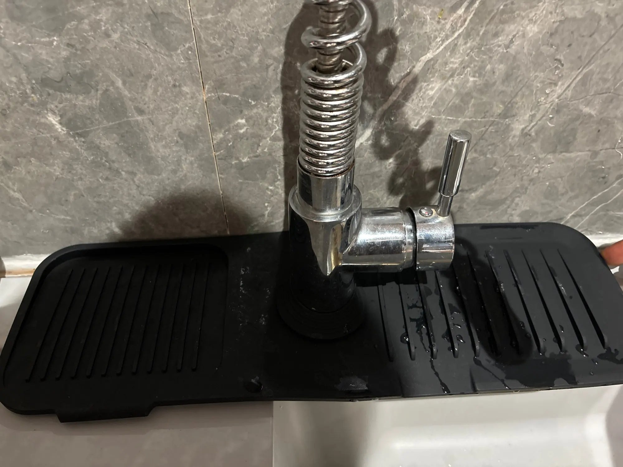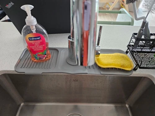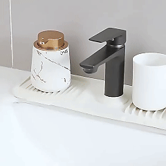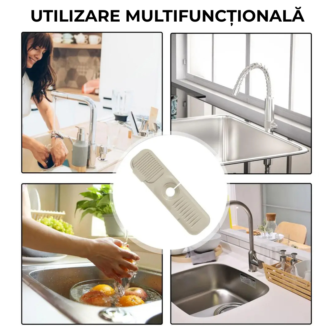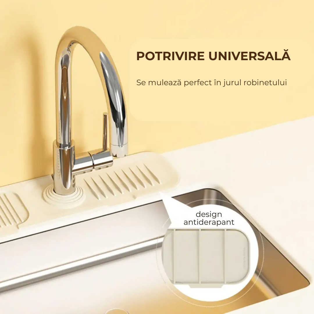 Se mulează perfect pe suprafețele curbate din jurul robinetului, prevenind stropirea apei pe blat și păstrând ordinea în bucătărie.