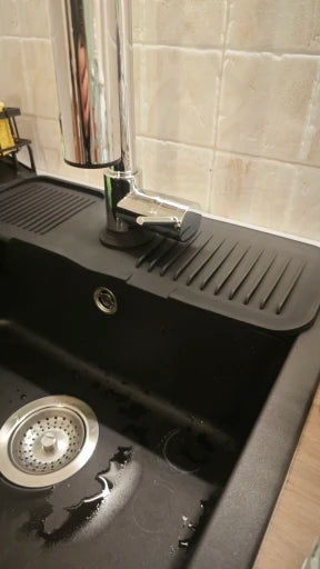 Covorașul are o înclinație care permite drenarea rapidă a apei direct în chiuvetă, prevenind acumularea de lichid și menținând zona uscată și curată.