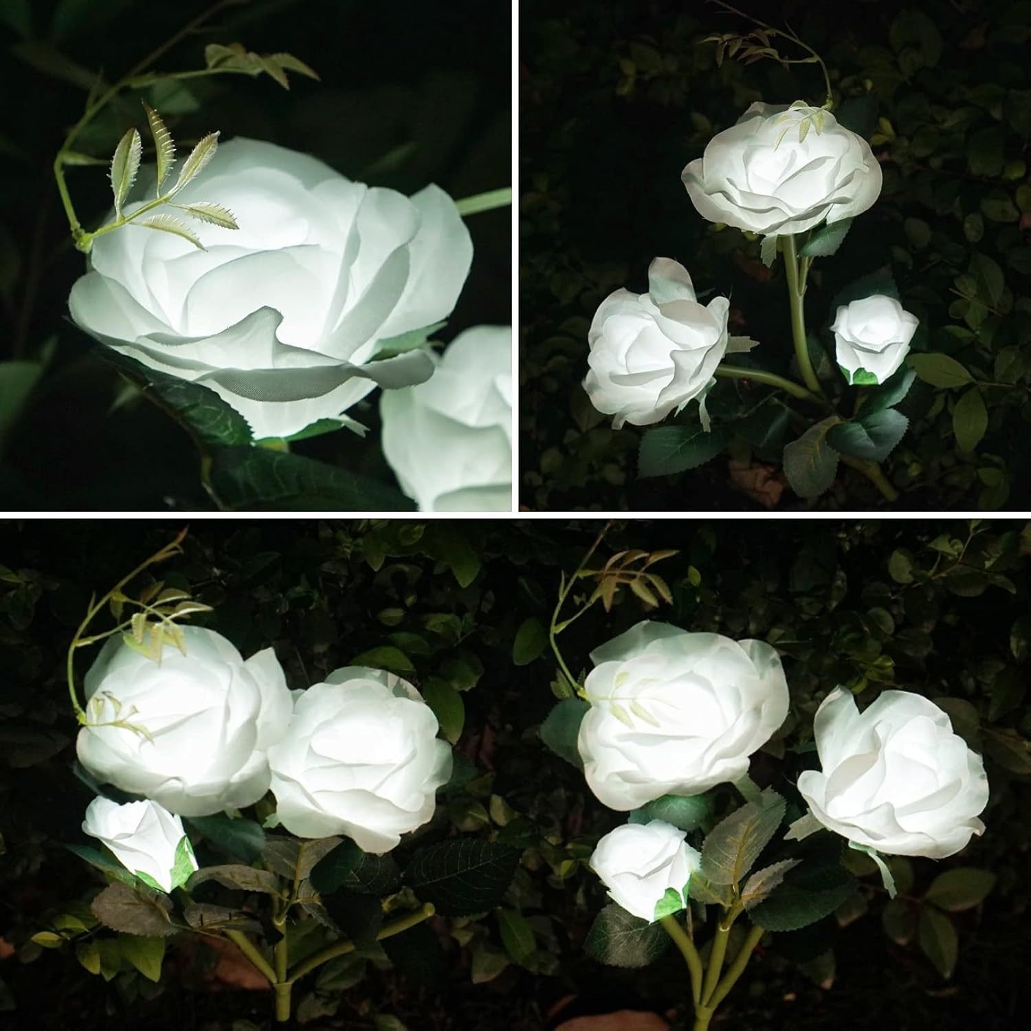 🌹 Adauga un farmec romantic gradinii tale cu acest set de 2 lampi solare trandafir alb cu 3 flori LED fiecare! Un decor elegant si functional, perfect pentru alei, gradini, curti, jardiniere sau chiar ghivece mari. Se incarca ziua de la soare si lumineaza noaptea automat – fara cabluri sau consum electric.