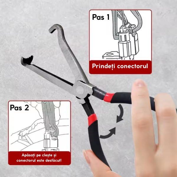 Cleștii permit prinderea fermă a conectorilor cu sistem push-tab, eliminând riscul de deteriorare. Poți debloca și scoate piesele dintr-o singură mișcare.