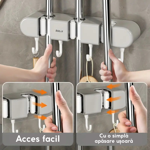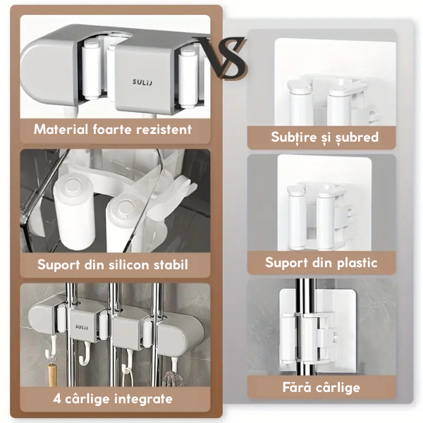 "Are niște suporți din silicon care chiar țin mopul fix, chiar dacă nu atinge solul. L-am montat rapid și pare foarte robust!"