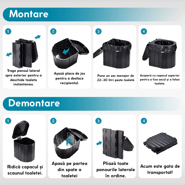 Această toaletă cântărește doar 1 kg dar suportă până la 150 kg. Se pliază până la doar 5 cm grosime, ocupând spațiu minim în portbagaj sau rucsac. Perfectă pentru: